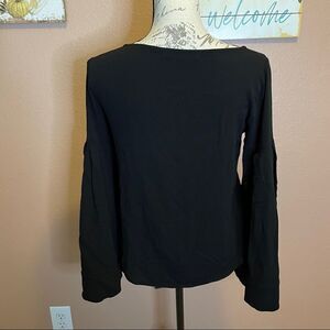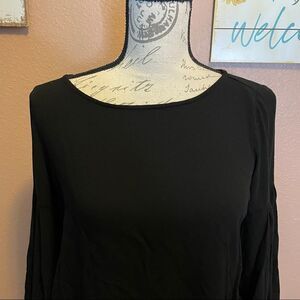 Beautiful black blouse Scoop neck and bell sleeves Material is soft Shirt pulls on Has been worn and cleaned Smoke free home Measurements in photos We love offers