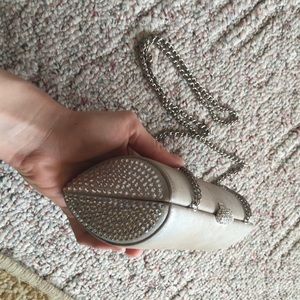 RODO Platinum leather clutch with Swarovski crystal embellishment. Worn only once at a gala! In very good condition has all crystals! Canvas lining with a chain strap. Made in Italy. Gorgeous and classy definitely an eye catcher! Great for a special evening or event!!!! Will take $200 email me Emilymariefarache@gmail.com