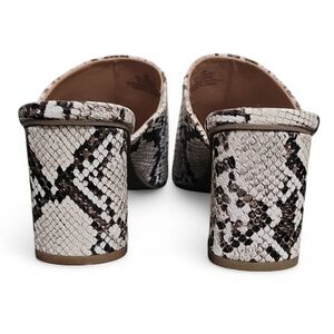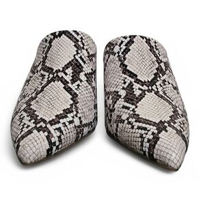 These stylish mules showcase a striking cream and black snakeskin pattern that elevates any outfit. The pointed toe design and medium wedge heel offer a perfect blend of elegance and comfort, making them ideal for various occasions.