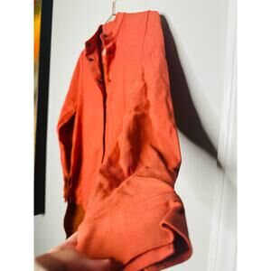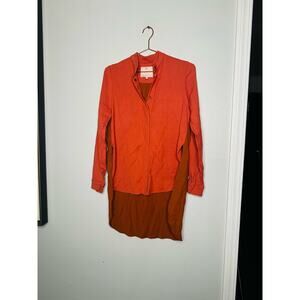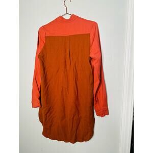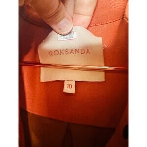 ROKSANDA Burnt Orange Two Tone Colorblock Button Down Wool Blend Shirtdress10. ROKSANDA Burnt Orange Two Tone Colorblock Button Down Wool Blend Shirtdress is a striking and elegant piece. It features a vibrant burnt orange hue that dominates the majority of the dress, creating a warm and rich tone. The colorblock design introduces a contrasting color, likely in a more muted or complementary shade, which adds visual interest and a modern twist to the classic shirtdress silhouette.