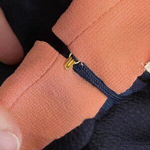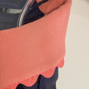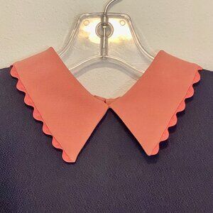 This lovely blouse was used to style a photo shoot and only worn once. Fabric is a searsucker silk crepe with a soft sheen. Scalloped trimmed sleeves and collar. Flared cuff sleeves. Collar has contrasting scallop trim a muted coral and a brighter coral. True colors show in photo of collar close up. Hidden zipper in back with hook and eye closure. 100% silk. Dry clean only.