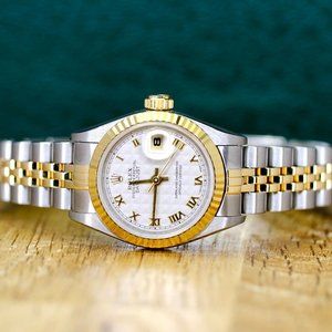 ROLEX DATEJUST CREAM PYRAMID ROMAN DIAL 18KY FLUTED JUBILEE TWO-TONE WATCH 69173