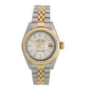 ROLEX DATEJUST CREAM TAPESTRY INDEX DIAL 18KY FLUTED JUBILEE TWOTONE WATCH 69173