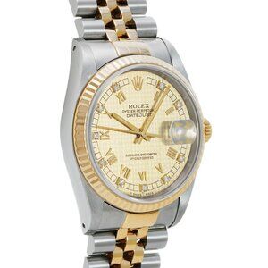 Details Movement:Mechanical Automatic / Cal.3135 Dial Color:Champagne Houndstooth/diamond Case:stainless steel/Yellow Gold Windshield material:Sapphire crystal windshield Bezel:Yellow Gold Bracelet:Jubilee bracelet(stainless steel/Yellow Gold)
