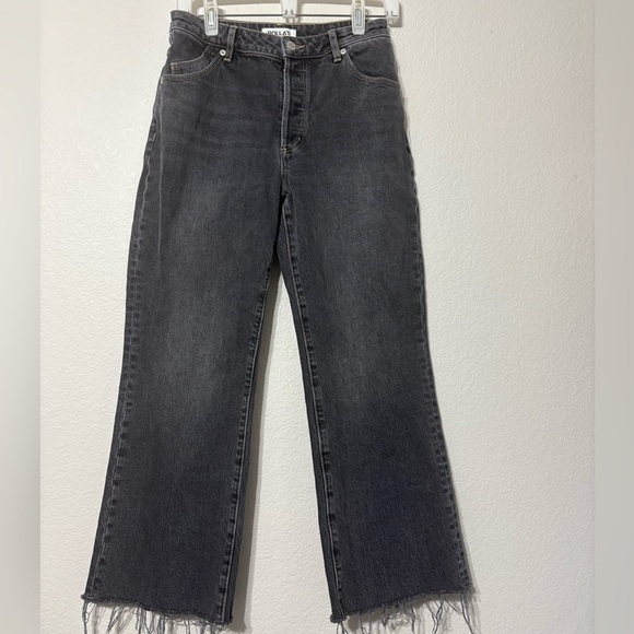 ROLLA'S Classic Flare Crop in Shadow. Charcoal Washed Black Denim. Raw Hem.