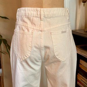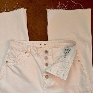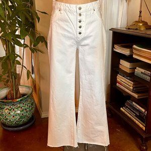High-waisted, white wide-leg jeans. Cropped with a raw hem, and buttonfly closure. Never been worn, in perfect condition. Marked size 27 and provides stretch, true to size.