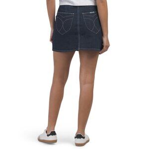 Brand New Color: Dark Denim contrast stitching, 4 pocket style, denim finish, fabric provides stretch button fly closure 16in long, taken from size 26 a-line skirt cotton/polyester/elastane