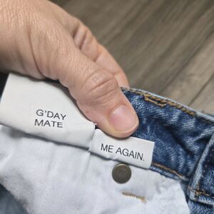 - Details: Zip fly with button closure, five-pocket design, branded back patch, playful inner tags (GDAY MATE / ME AGAIN)