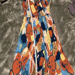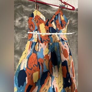 Stylish dress with abstract patterns. Features blue, orange, and cream tones.