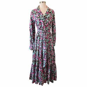 ROLLER RABBIT Shirt Maxi Dress Floral Blue Long Sleeve Cotton Button Down Medium