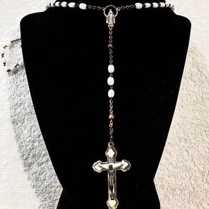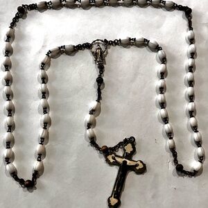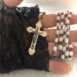 BEAUTIFUL VINTAGE PEARL WHITE GLASS TUBE BEADED ROSARY CENTERPIECE