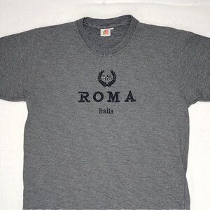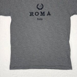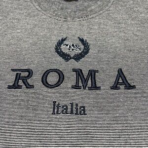 <Features> Tourist Tee shirt from Italy. Thick embroidery of the words “Roma Italia” also a Brooks Brothers style “Crest” in the center. The shirt made of mini Grey and blue stripes. Has a euro vibe for sure.
