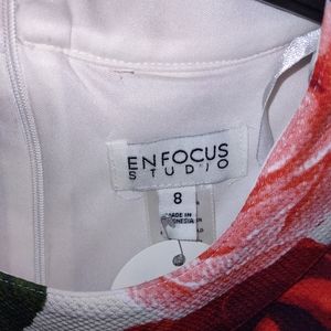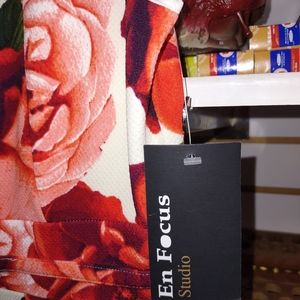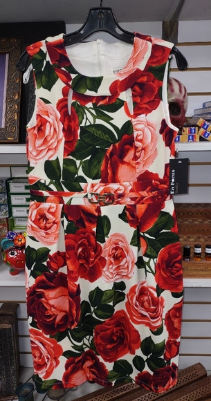 Original tags attached. White base with beautiful romantic red & pink rose print. Dimpled texture. Sleeveless. Gold buckle detail in front, at waist. Hem hits right about at the knee. Back-zip.