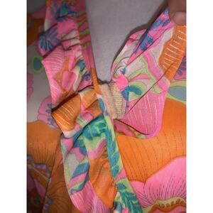 This romantic 1970s vintage dressing gown robe features ruffled angel wing sleeves, perfect for adding a touch of whimsy to any outfit. Made from polyamide in a multi-color palette, this gown exudes a beautiful art deco look, ideal for casual occasions. With a size ranging from S to M, this unbranded piece was designed in Canada and embodies the unique style of the 1970s era. Perfect for those who appreciate vintage fashion and want to make a statement with their attire.