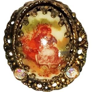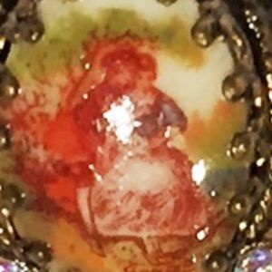 BEAUTIFUL VINTAGE CAMEO STYLE EARRINGS WITH A FRAGROUD ROMANTIC COUPLE COLOR TRANSFER ON A GLASS OVAL STONE, THIS IS SET INTO A VERY ELEGANT AND DETAILED PRONG SETTING THAT IS MOUNTED ON A FILAGREE SETTING, CLIP BACK..