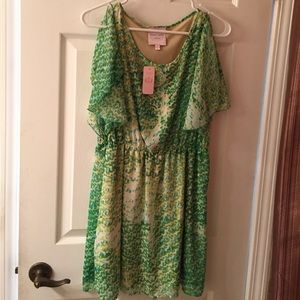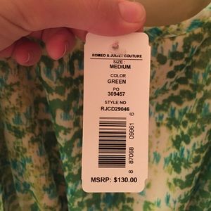 New with tags! Romeo and Juliet Couture women's above the knee dress. Size medium. Green floral detail. Sleeveless dress with cinched waist and flutter sleeve detail.