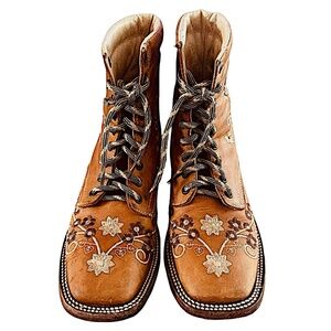 ROMEO BOOTS Women’s Leather Booties Size 6.5 Lace-up Camel Tone Embroidered
