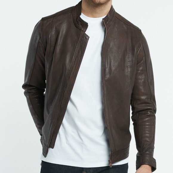 Luxurious lambskin leather café-racer jacket is a modern bomber-style in a slimmer silhouette. Versatile outerwear staple to dress-up or dress down!