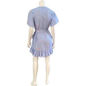 Elegant wrap dress featuring blue and white stripes, complete with charming flamingo embroidery and a ruffle hem. Ideal for summer wear. Size small.