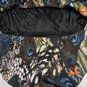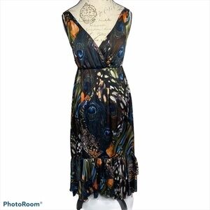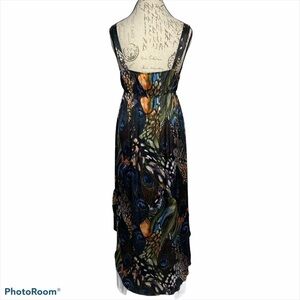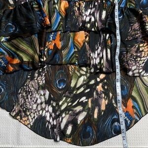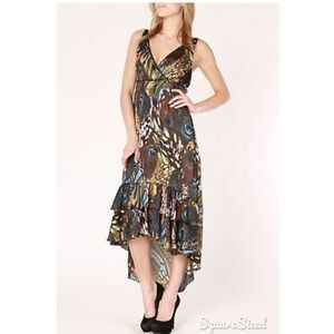 Gorgeous hi low hem dress in a peacock feather print. Double ruffle at bottom hem in front. Crossover bodice with empire waist and fully lined. Excellent condition.