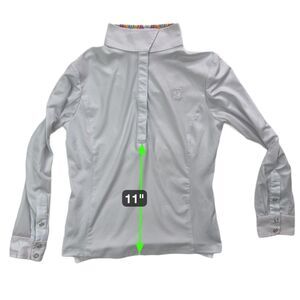 equestrian show shirt, competition shirt, youth riding apparel, performance fabric, cooling technology, snap collar, long sleeve, white, lot of 2, bundle, girls large, junior rider, hunter jumper, dressage, schooling shirt, sun protection, moisture wicking