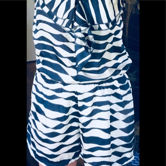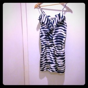 Blue & White striped, with ruffles down the front; elastic at the waist, and spaghetti straps. So Cute!