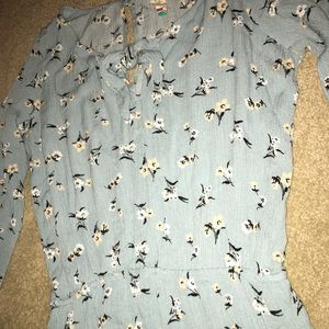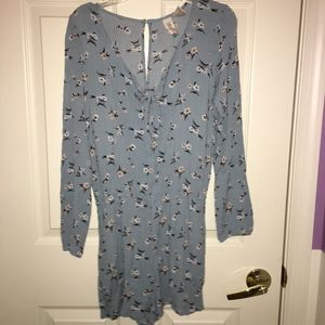 light blue floral romper with pockets and tie at the front! Has a button keyhole feature on the back. Never been worn in perfect condition!