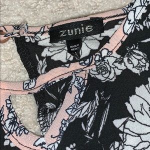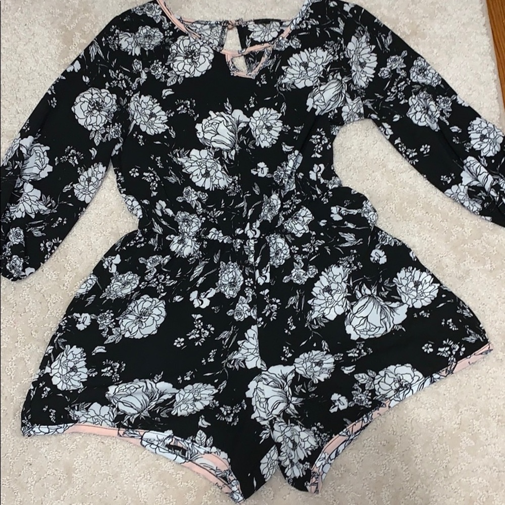 romper shorts with black and white flower print pink on neck line and cropped sleeves!!
