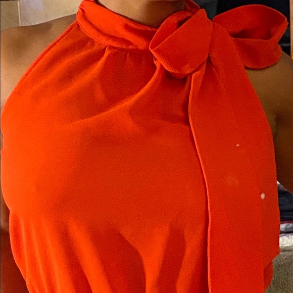 ‘Orange’ Romper with opening in the back with ‘one button’, two front pockets and fastened in the back of the neck and a cute bow that you can make with the long tie.