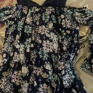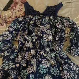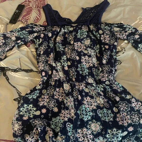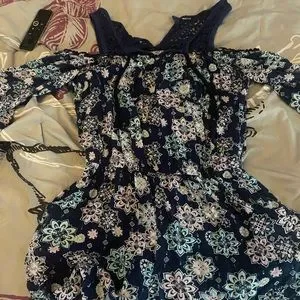 navy/dark blue color with beautiful flowers around it! It is beautiful for the spring. keep in kind the button the back did break but other then that it’s a beautiful romper!