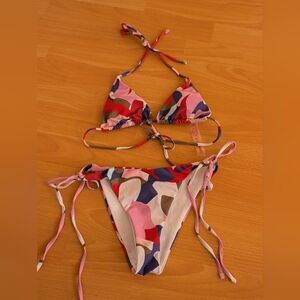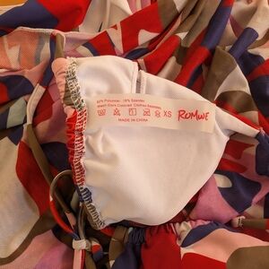 Stylish bikini set by ROMWE. Features abstract design in red, blue, and tan. Includes matching sarong.