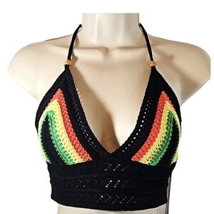 ROMWE Aesthetic on Lock beautiful crop top swimming cover-up. Hollow out halter knit cropped length. Color Black, tie on neck and criss-cross tie on back. Black with orange, yellow, and green color block in bust cups.