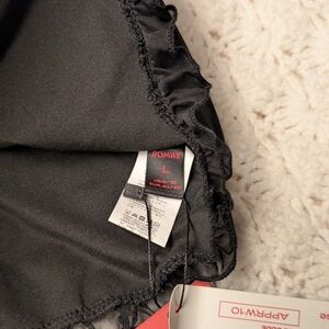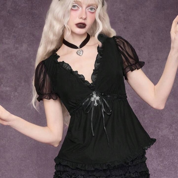 Chic black top with ruffled edges. Sheer fabric add