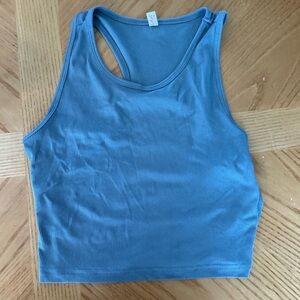 Stylish blue ribbed crop top. Sleeveless design. Perfect for casual wear.