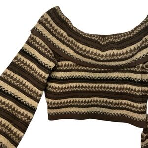 Cozy and stylish striped knit sweater top featuring earthy brown, tan, and cream tones in a bold pattern. Designed with an off-the-shoulder neckline and bell sleeves, this sweater has a cropped fit that pairs perfectly with high-waisted jeans, skirts, or layered over dresses. A great piece for a boho, retro, or Y2K-inspired wardrobe.