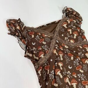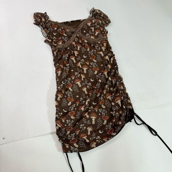 ROMWE Dress Womens XL Brown Mushrooms Ruched Bodycon babydoll y2k 90s whimsy