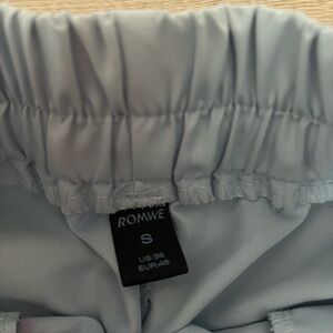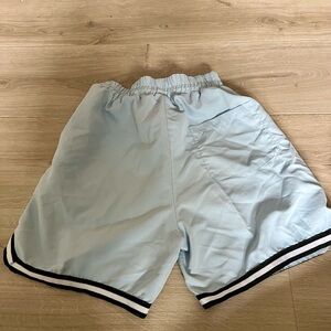 Authentic ROMWE basketball shorts in light blue with bold pink graphic design and striped trim. Features elastic waistband with drawstring and one back pocket. Marked size Small (US 36 / EUR 46).