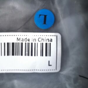 Blue circle tag with letter T. Includes barcode label. Size L.