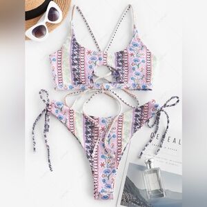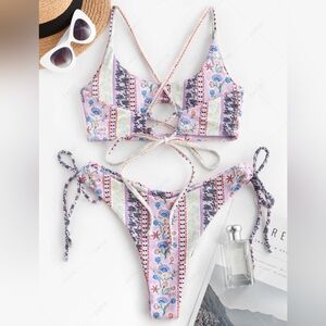 Dive into style with the ROMWE bikini set, featuring a chic pink and blue color palette. This two-piece swimwear combines a sporty aesthetic with a fashionable flair, offering a comfortable fit with its sports bra-style top and high-waisted bottoms. The vibrant colors and contemporary design make it a standout choice for any beach or poolside occasion.