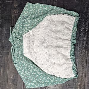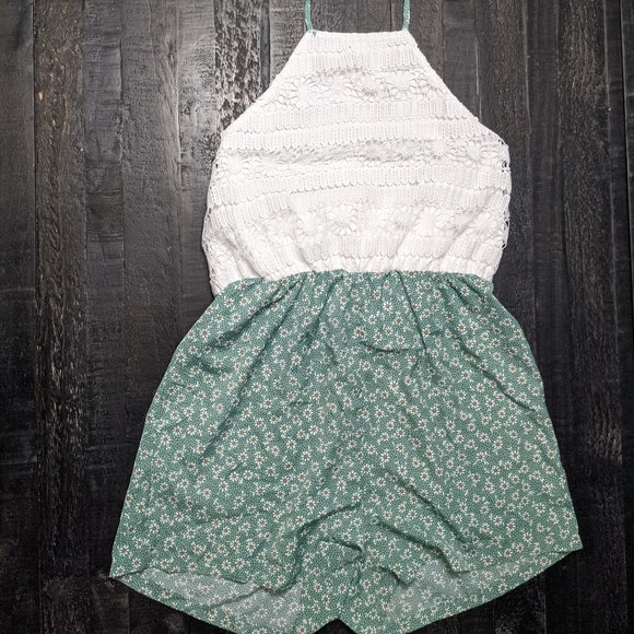 Green and white floral patterned and lace halter top romper from Romwe. Great for summer and spring. Never been worn, just tried on. Nothing wrong with it.