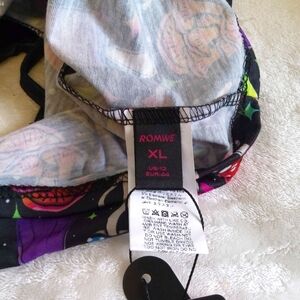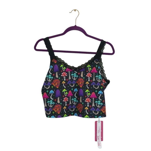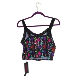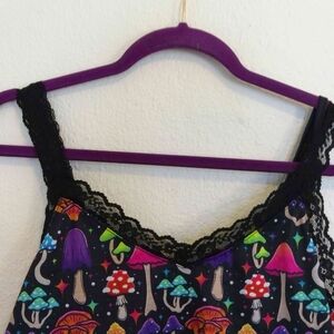 Vibrant tank top with a playful mushroom print. Features lace trim and a colorful design. Measurements are pit to pit is 17" and length is 121/2".