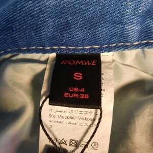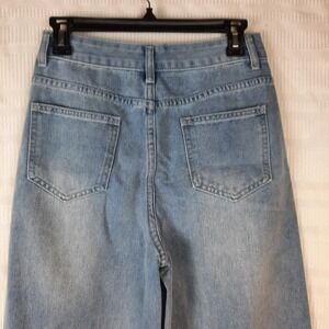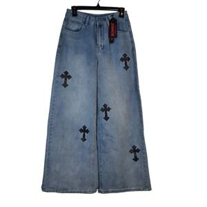 The Romwe Wide-Leg Jeans are a trendy and stylish addition to any wardrobe. The relaxed fit make them comfortable and flattering for women. The cross print design adds a touch of punk and grunge to the hipster and festival themes. The blue color is versatile and perfect for any city setting. These jeans are perfect for those who want to make a statement with their fashion choices. Button and zip closure. High rise 12", Waist 26", Hip 40", Inseam 28", Length 39.5", Leg width 24". New with Tags.