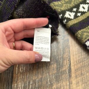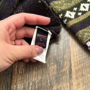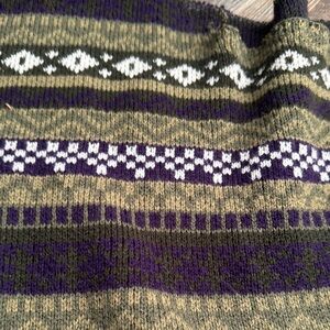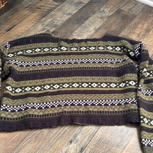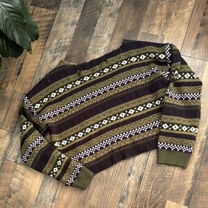 Stay warm and stylish with this striped patterned sweater. Featuring a blend of purple, green, and brown colors, this sweater is perfect for any casual outing.