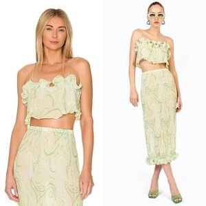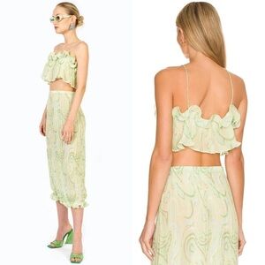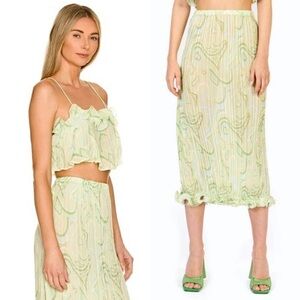 RONNY KOBO Pleated Crinkle Georgette Sage Swirl Print Ruffle Hem Midi Skirt XS