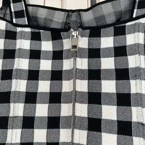 Curve-hugging sheath dress with a feminine gingham print throughout.