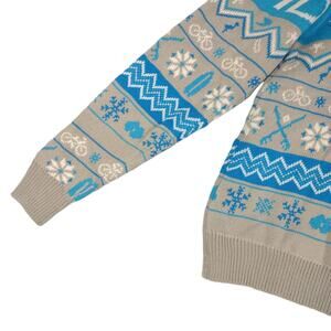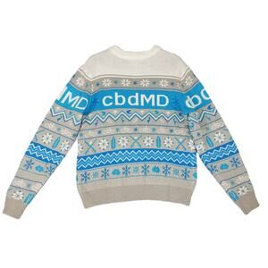 -Features: Fair Isle knit pattern with "cbdMD" text, snowflakes, bicycles, surfboards and more, long sleeve, crewneck, ribbed hems and cuffs