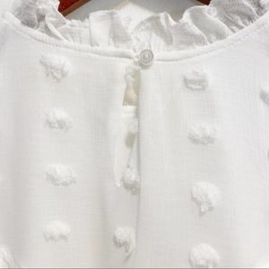 New with tags ROOLEE white ruffled lined shirt. Lined with high collar with button keyhole in the back. Puffed polka dots.