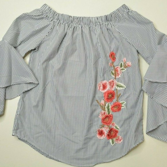 ROOMMATES Sz S Women OFF Shoulder STRIPE Flower EMBROIDER Flare ANGEL Sleeve TOP