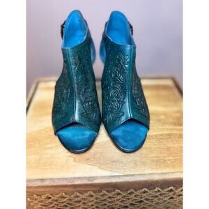 Burnished Turquoise Handtooled Design * Leather * 3" Heel * Closed Back Open Toe Mule *