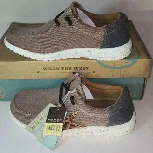 Womens Roper Shoes: Ladies Roper Casual Shoes. Stay comfortable in these women's hang loose shoes from Roper. These women's have a brown canvas upper with elastic flat laces for an easy fit. You will love the memory foam comfort insole as well as the lightweight EVA molded bottom. They feature a multi leopard star on the side of them and have a round toe with a moisture wicking